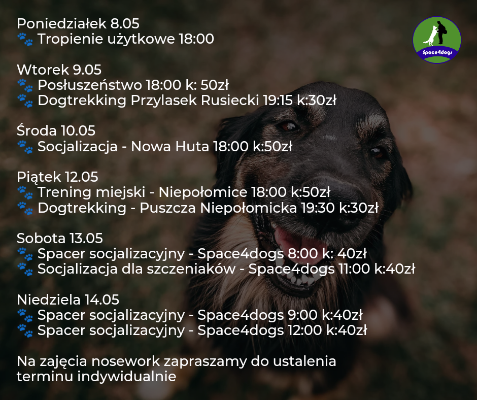 Zapisy na zajęcia prowadzimy z tygodnia na tydzień. W każdą niedzielę o godzinie 18 pojawia się nowy plan zajęć na kolejny tydzień. Grafik możecie znaleźć na fanpage’u Space4dogs – Szkoła i Hotel dla psów na Facebooku https://www.facebook.com/people/Space4dogs-Szko%C5%82a-i-hotel-dla-ps%C3%B3w/100083536291880/